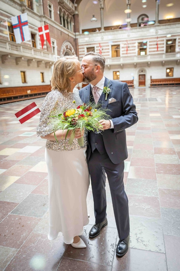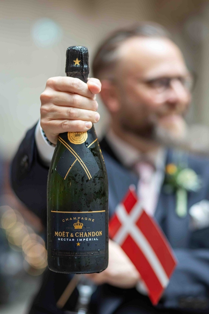 Two gorgeous boys later, they are settled as a family of four in Copenhagen and we had the absolute pleasure of documenting their nuptials in City Hall in Copenhagen city centre, surrounded by their core group of family and close friends. Blue Moêt pops and Danish tasties in the hall afterwards and of course photo time with double sided Danish//Latvia flags. Nice touch from Sister Liene, and cute bubbles from Thomas’ Mum.